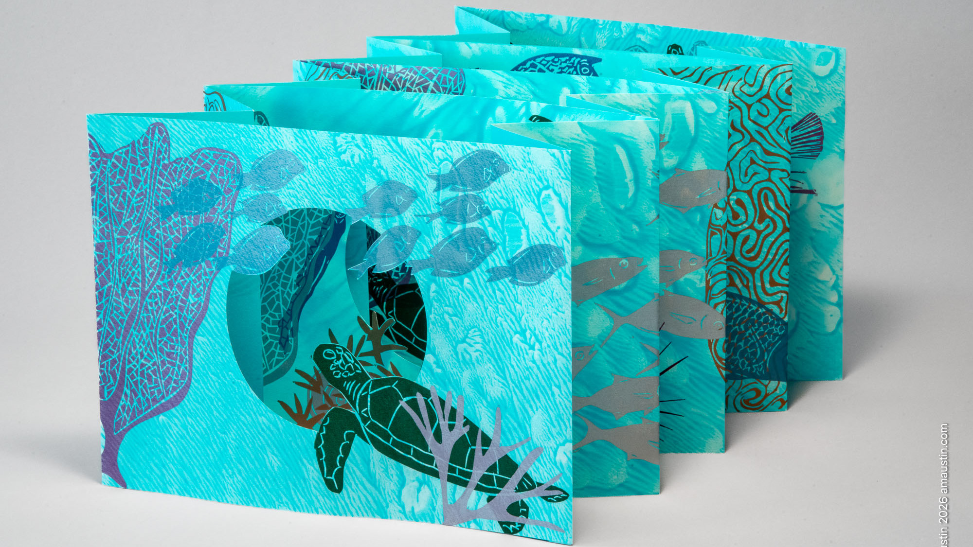 Tunnel book with five panels gives a glimpse into the Caribbean Sea, and shows some of the animals living together there on the coral reef.